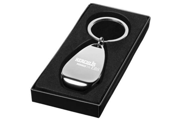 Porte-clés en métal argenté à la finition soignée, à la fois élégant et pratique.